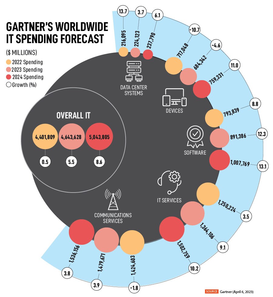In more cheerful news, worldwide IT spending is projected to total at $4.6 trillion in 2023, an increase of 5.5 percent from 2022, according to the latest forecast by Gartner, widely seen as the top IT market researcher advising enterprise CIOs on their tech spending.