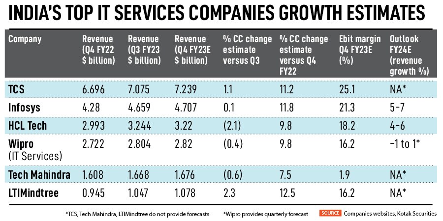 India’s top two IT services companies are expected to report their earnings this week. Tata Consultancy Services, amid a transition to a new CEO, will report its Q4 and FY23 results on April 12, and Infosys on April 13.
