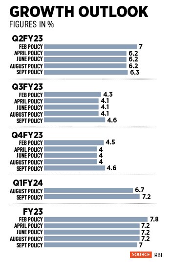 In short, the adverse turn of macroeconomic events pushed the central bank to prioritise inflation over growth. Since May, the RBI’s rate-setting panel has raised the repo rate by 1.9 percent to 5.9 percent.
