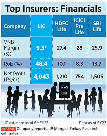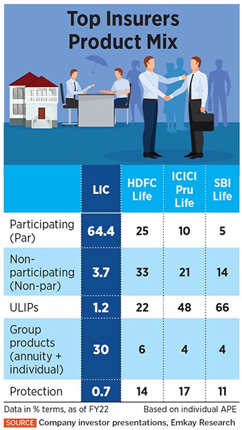 Unlike most private insurers, LIC’s product mix comprises selling participating (Par) policies, through its vast agent network of 1.3 million people as of April 2022. Participating policies are those where policyholders benefit in the form of a share of profits that the insurance company makes. This has led to lower profitability. LIC’s sales of ULIPs and retail protection schemes are negligible, which are usually expected to offer better returns to customers.