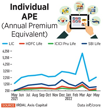 SBI Life, a private life insurance firm, reported the highest growth in Individual weighted received premium (WRP), which is the sum of the first-year premium on renewal policies and 10 percent of single premium policies. SBI grew by 193.6 percent year-on-year in individual WRP in May 2022, at Rs 838.1 crore. LIC reported a growth of 65.1 percent in the individual WRP for the same period.