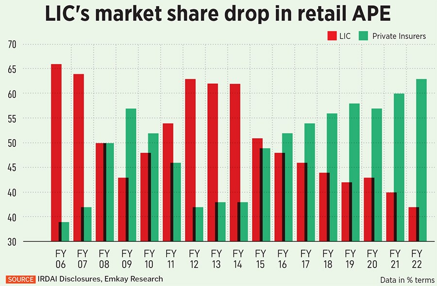 But to understand the business of LIC, some important factors need to be outlined, which make it distinctive. LIC has, for over sixty years, been a household name for all families in India, carrying out most of its business by selling single premium (non-recurring) instruments. But it has also been losing market share for years to private bank-led insurance companies, in retail annual premium equivalent (APE), which indicates new business sales. LIC leads in terms of new business premium (NBP) with a 61.4 percent market share.