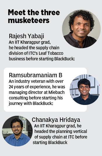 Six years ago, it was a question of muscle versus fat for Rajesh Yabaji. The answer looked like a no-brainer for the IIT-Kharagpur graduate who headed the supply chain division of ITC’s leaf tobacco business before co-founding BlackBuck in April 2015 with Chanakya Hridaya and Ramasubramaniam B. The medium-framed man with a muscular built opted for brawn. “Our gross margin used to be 15 percent," he recalls, alluding to the performance of his fledgling B2B online trucking platform during the first few months. The flattering business metrics made sense. Reason: Too much operational inefficiency plagued the transportation industry. “We used to make a lot of money on every transaction," recounts a beaming CEO, who built the business looking to solve the problem of corporate big boys such as Coca-Cola, HUL and PepsiCo. Within a week of starting, BlackBuck raised $5 million in seed round in April.