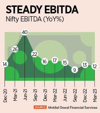 Analysis showed that the Ebitda (earnings before interest, taxes, depreciation, and amortisation) of Nifty companies were steady after picking up in the December quarter. It grew 12 percent YoY in the March quarter compared to 13 percent jump in the previous quarter and 9 percent in the September quarter. The Ebitda of the same set of companies, however, was at 17 percent growth in the March quarter of last fiscal. Excluding financials, the Ebitda margins climbed 19.2 percent in Q4FY23, from 18.7 percent in previous quarter. It was at 19.9 percent in March quarter of FY22.