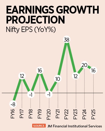 “Earnings have been growing at a very healthy rate for past three fiscal years after a phase of muted growth in earnings from FY2014 to FY2020. Over the last three years, Nifty earnings per share (EPS) has moved up close to Rs820-825 per share in FY2023 as against Rs444 per share in FY2020. Over the next two years also, the consensus estimates show expectation of mid double digit growth in net earnings which would take Nifty EPS to Rs1,070-1,080 range by FY2025," explains Dua.
