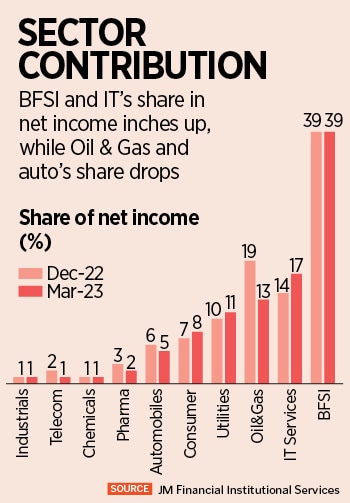 Banking, financial services and insurance (BFSI) and Information Technology (IT) contributed to more than half of the profit pool. While the share of oil & gas in the net income inched up sequentially, the fall in the share of the IT sector reflected the impact of the slowdown as the sector is most exposed to the developed markets economies, according to analysis by Hitesh Suvarna, analyst, JM Financial Institutional Services.