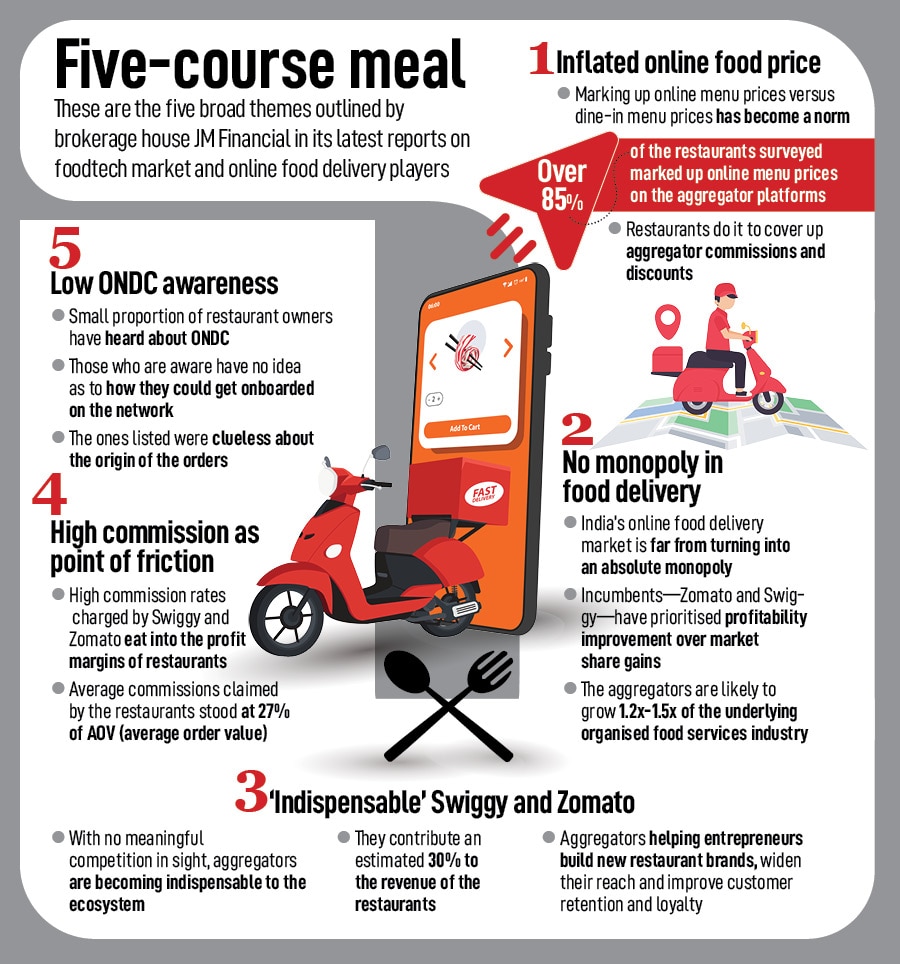 The ‘practice’ highlighted by Malhotra, JM Financial and Dean is known as ‘markup’, which means jacking up or inflating online menu prices. In simple terms, what it means is that restaurants are charging more—some even go to the extent of pushing it over 50 percent—for food items and listing them on food aggregating platforms as compared to what the same set of food items would cost at a restaurant. A marked difference in the delivery and in-store price, points out JM Financial, has become a norm in the foodtech industry. “More than 85 percent of the restaurants surveyed said that they had marked up their online menu prices," the report highlights. Though restaurants claim that markups are necessary to recoup upfront customer discounts and compensate for high commissions charged by the food delivery aggregators, the latter are unlikely to stop such practices. The reason is obvious. Forcing price parity, underlines the note, with restaurants’ offline menus will either increase the friction on commissions or force them to scale down discounts. “Both of which would be undesirable outcomes from the aggregators’ perspective," it adds.
