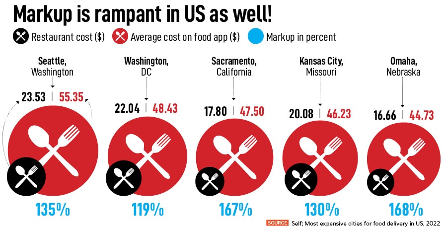 With consumers at the receiving end, the obnoxious practice of ‘inflated price’ for the online menu is not confined to India alone. Take, for instance, a study conducted last year in the US. Self, a credit building site, tried to find out how the price of food delivery changes across the US. It reportedly placed McDonald’s orders in the 100 largest metropolitan areas on Uber Eats, DoorDash and Grubhub. The results were startling. Seattle emerged as the most expensive city for food delivery apps. With a restaurant cost of $23.95, and the cost on the food app at $55.35, there was a markup of 135 percent! (See box)