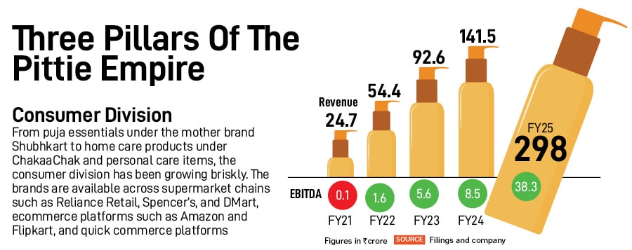 The ‘commodity-to-brand’ strategy seems to be working. Look at the numbers. In FY19, Shubhkart clocked sales of Rs10 crore. Five years later, it posted Rs118 crore in revenue in FY24. The brand is now clocking a run rate of Rs200 crore. ChakaaChak, a cleaning brand for home and homecare products, has grown from Rs4 crore in FY21 to Rs18 crore in FY24, and is all set to touch the Rs40-crore mark in March 2025. Pittie started Chakaachak with jhadu (broom), and then added dust pans, bucket mops and wipers. “Non-dust or plastic broom has become our bestseller," he claims. “We built a brand out of jhadu," he smiles, adding that the consumer division of Pittie Group has grown over five times from Rs24.7 crore in FY21 to Rs141.5 crore in FY24. “We are on track to touch the Rs300-crore mark by FY25," he claims. What started with puja products under the wellness category now has three more revenue engines in homecare, personal care and food divisions (see box).