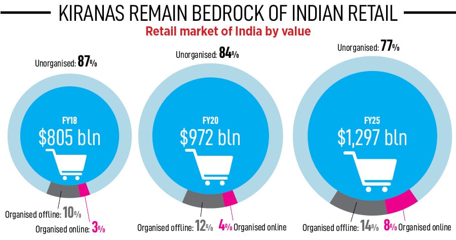 For suitors like Metro, who are aggressively wooing kiranas with unique and customised services, offers and products, the future prospects are promising. By 2025, according to estimates by consulting firm Redseer, the Indian retail market will increase to $1,297 billion in value, of which organised online play would be just 8 percent. While 14 percent would remain with organised offline players, a staggering 77 percent would still be unorganised.
