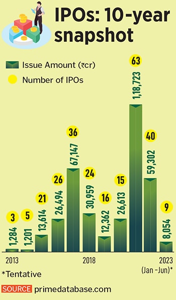 For instance, in January to June so far, there have been only nine IPOs, which collectively raised Rs 8,053.64 crore, shows a Forbes India analysis of data provided by Prime Database. In contrast, there were 16 IPOs in first six months of last year, which raised Rs 40,310.61 crore. However, overall stock markets were on a decline in that period, with the Sensex falling nearly 9 percent in January-to-June 2022.