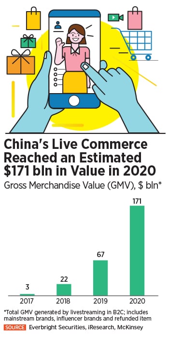 This “live commerce" trend is massively popular in China where it is projected to become a 961 billion yuan ($135 billion) industry this year, according to Chinese data provider iResearch