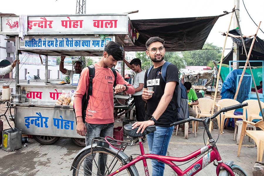 Vikas Patidar came to Kota from Indore to become a doctor. The journey in the city, he says, is not easy. It"s a mental, physical, emotional and financial investment. He cycles his way to a coaching centre, stopping on the way for some breakfast as the only form of recreation and exercise on most days. Image: Madhu Kapparath