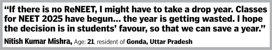 “It’s been more than two months since we attempted NEET. Before the exam, we have a rhythm and momentum to study. It’s all lost now," says Tomar. “So much time has been wasted. We’re confused about preparing for re-examination or taking a drop year to join classes that have already started preparing students for the next year. Will the Supreme Court give us as much time to prepare as the time that has been lost?" he adds.