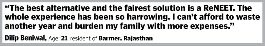 For some aspirants like Bihar’s Kumar, who has studied in a government school, and wanted to become a doctor to fulfil his father"s dream, it’s time to take some tough decisions. “I’m still confused about carrying this journey ahead. I think about giving up multiple times a day," he confesses. “I don’t think I can attempt the ReNEET with the same potential. I study all day, but keep thinking what if there is another scam."