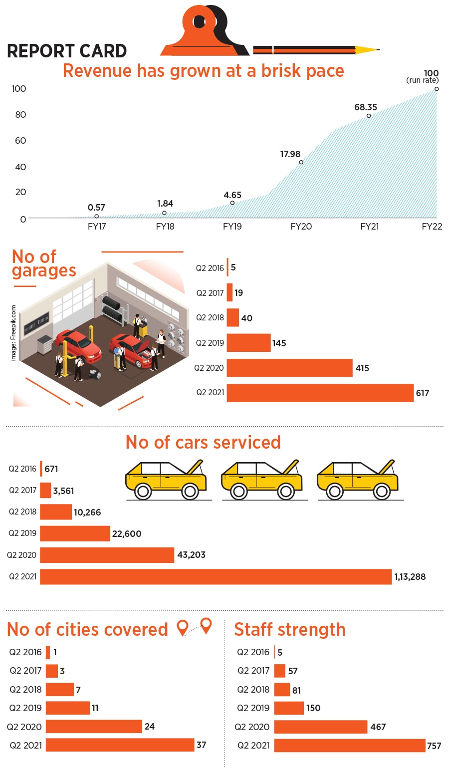 The gambit paid off. From just five garages and one city—Delhi NCR--and a revenue of Rs 1.87 crore in the second quarter of 2016, the numbers jumped to Rs 4.64 crore, 19 garages and three cities in Q2 2017. There was no looking back. GoMechanic seemed like a well-oiled machine. Revenues leapt from Rs 4.65 crore in FY19 to Rs 68.35 crore in FY21. In terms of footprint and cars serviced, the growth was equally staggering: From 10,266 cars serviced in Q2 of 2018 to 1,13,288 in Q2 of this year from 7 cities to 37 and from 40 garages to 617.