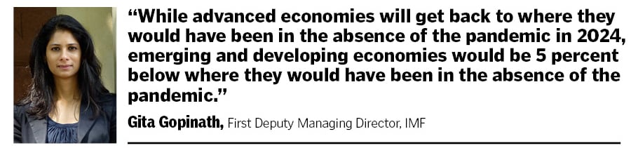 “While advanced economies, as per our estimates, will basically get back to where they would have been in the absence of the pandemic in 2024, emerging and developing economies would be 5 percent below where they would have been in the absence of the pandemic," Gopinath said at a special WEF session in Davos.