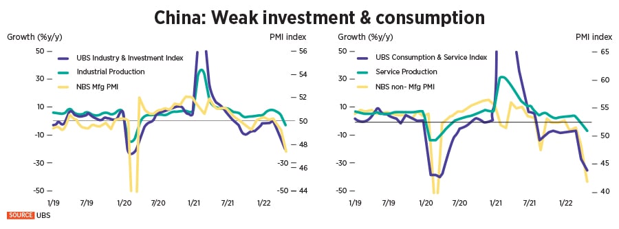 Although People’s Bank of China has bucked the global trend by reducing interest rates to boost borrowing and consumer spending, unemployment is on the rise, and lead indicators of economic activity are weak (see charts). UBS has cut its China GDP growth forecast to 3 percent from 4.2 percent for 2022.