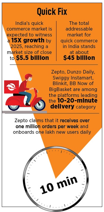 According to a 2022 RedSeer Consulting report, the total addressable market for quick commerce in India is $45 billion, driven by urban areas on the back of mid-high-income households. Currently, players like Zepto, Dunzo Daily, Swiggy Instamart, BB Now (BigBasket’s quick delivery offering) and Blinkit (formerly Grofers) are dominating the space, offering anything between 10-minute to 30-minute delivery times. The report adds that India’s quick commerce market is set to touch $5.5 billion by 2025—15 times its current size.