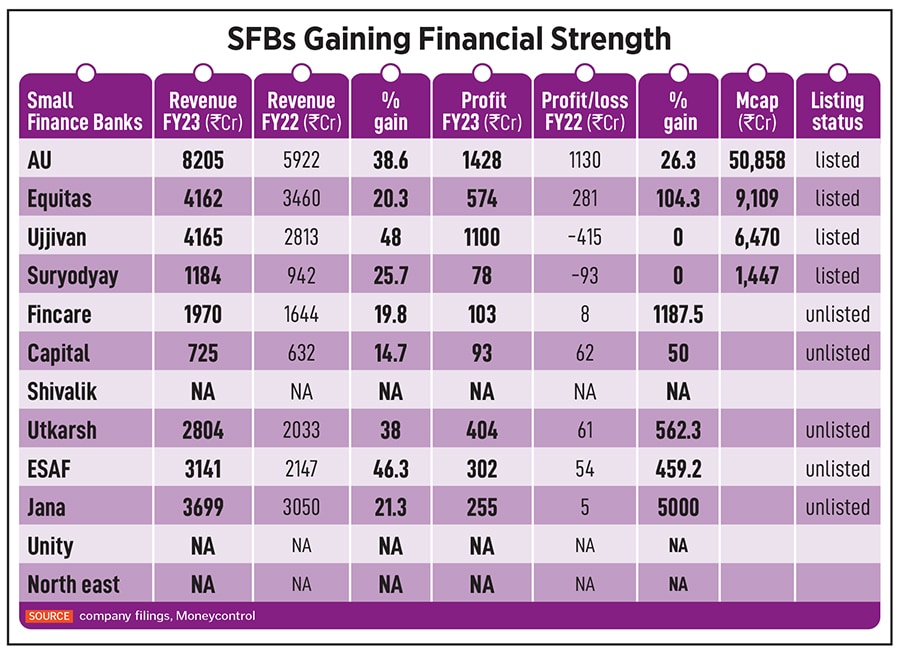 Jain and Samra say Capital SFB plans for a listing, but will wait for the “markets to get stabilised". The bank had filed its red herring prospectus, but the one-year timeline to list expired in February. In the meantime, Capital plans for a smaller offering to private equity investors. “We are looking for growth capital rather than regulatory capital," Jain says. In April, the bank raised Rs64 crore from a host of investors, including Max Life Insurance, Amicus Capital and Pi Ventures. The fundraising was made easier by a stellar performance in FY23 as well as a 5.1 percent cost of funds (the lowest among any SFB) that allows the bank to be as competitive with its loan products as its larger rivals. ESAF SFB has also filed its DRHP with Sebi.