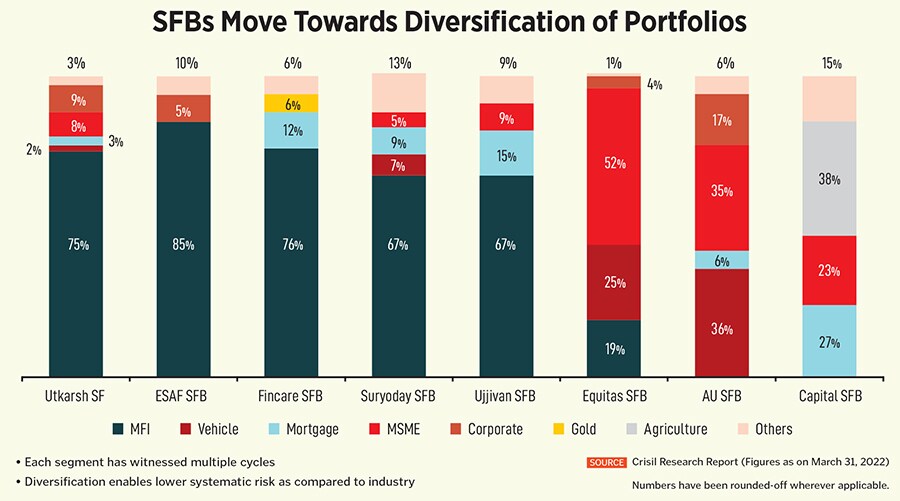 The RBI, too, from a perspective of lowering risks for lending institutions, in March last year, granted microfinance firms the ability to lend more towards segments beyond microfinance, by reducing the minimum limit of microfinance loans of total loan assets to 75 percent. This has automatically allowed lending institutions to get a more balanced lending portfolio and lower their exposure to MFI-related risks. As a result, most SFBs are now in the process of reducing their microfinance exposure.