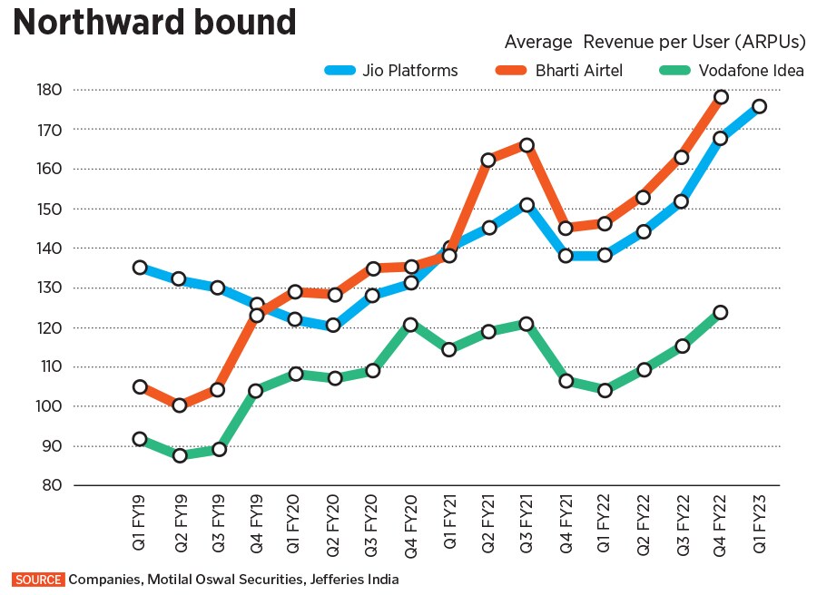 While average revenue per user (ARPU) has been on the rise through much of 2021, historically, Indian telcos have refrained from charging a premium for 4G plans (vs 2G/3G data plans). “With potentially higher speed on offer and likely initial uptake from premium customers (smartphones above Rs15,000), there is potential for telcos to charge a premium for 5G (versus 4G)," says Nomura’s Bansal. There is a strong possibility that 5G tariff plans would be monitorable in the near term, he adds, and 5G premium (versus 4G) may provide the next leg of ARPU uptick for telcos.