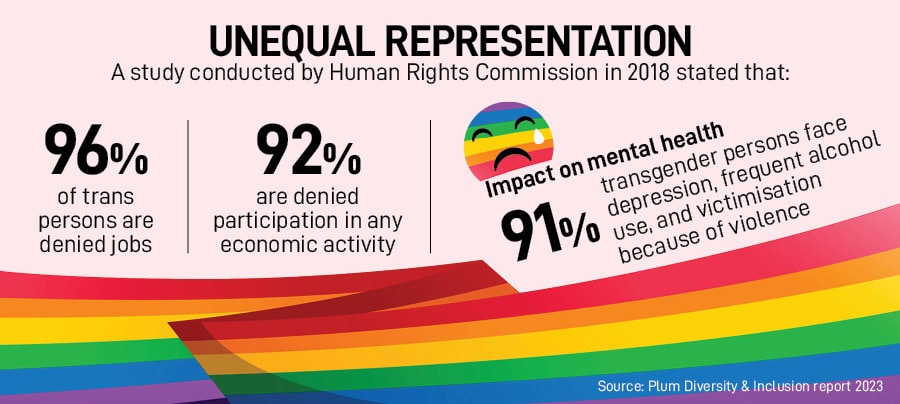 According to a study conducted by the Human Rights Commission in 2018, 96 percent of trans persons are denied jobs and 92 percent are denied participation in any economic activity. As per a World Bank study conducted in 2014, up to 1.7 percent of India’s GDP is lost out every year through LGBTQ+ exclusion. More recently, a 2022 study conducted by HR consulting firm Randstad India revealed that 53 percent of Indian companies do not have career-development opportunities for people from the LGBTQ+ community. It further revealed that only 9.5 percent of the surveyed organisations have made extremely significant efforts to be LGBTQ+ inclusive.