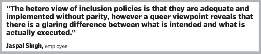 Jaspal Singh, 27, who works with one of the top audit houses in India, is worried that he and his fellow queer employees won’t be received as “normal" if they came out at their office. He says the policies for LGBTQ+ employees at the workplace are not part of the onboarding process, and are hence unclear. “There are a few rudimentary procedures such as employees being able to raise concerns to the internal committees. We are concerned, however, that we will not be received as perfectly capable if we wore our pride on our sleeves. So we conceal our sexual orientation and pass off as straight to avoid any conflict," says Singh.