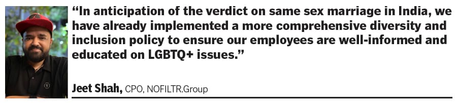 Jeet Shah, CPO, and Renitaa Keswani, COO of NOFILTR.Group, an influencer marketing agency, say it’s not just their employees but also about their creators for whom they aim for safety. The company follows the policy of not discriminating between gender, community or any social, material group frames. “We have both employees and creators from the queer community and we make sure they are heard equally as compared to other employees and creators," says Keswani. “In anticipation of the verdict on same-sex marriage in India, we have already implemented a more comprehensive diversity and inclusion policy to ensure our employees are well-informed and educated on LGBTQ+ issues," adds Shah.