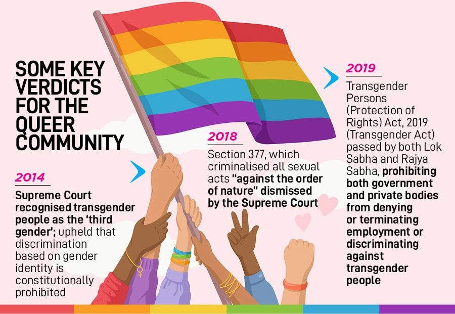 The Indian government and the justice system have passed several landmark judgements in favour of the queer community. Some include the 2014 judgement where the Supreme Court (SC) recognised transgender people as the ‘third gender’ and upheld that discrimination based on gender identity is constitutionally prohibited. Then, in 2018, the SC decriminalised Section 377, and, in 2019, the Transgender Persons (Protection of Rights) Act, 2019 (Transgender Act) was passed by both the Lok Sabha and the Rajya Sabha, prohibiting both government and private bodies from denying or terminating employment or discriminating against transgender people.