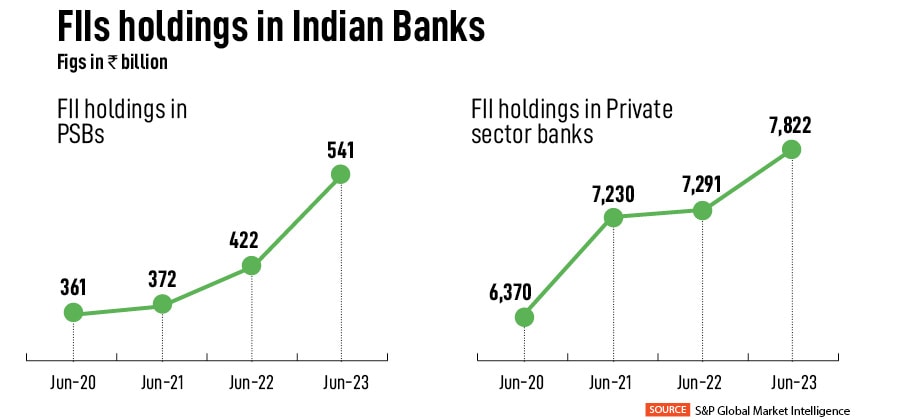 The total market value of foreign institutional investors" holdings in Indian banks has risen in recent years, climbing to Rs 8.36 lakh crore as of June 30, from Rs 7.71 lakh crore a year prior, according to data compiled by S&P Global Market Intelligence. This is a significant rise from Rs 6.73 lakh crore levels in June 2020.