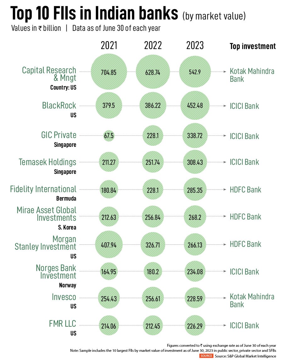 The top FIIs in Indian banks include Capital Research, BlackRock, Singapore’s GIC Private, Temasek Holdings and Fidelity International (see table).
