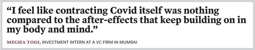 Todi, who founded a bootstrapped ecommerce startup for handcrafted lifestyle and home decor products in 2018, had to shut it down as she could no longer manage it alongside work commitments. “It’s been over two months and I’m still able to work at just 50 percent efficiency," she says. Todi explains that while people at work were understanding during her recovery, she doesn"t know how to explain the fact that she still falls ill every other day. “Ultimately, the perception is that I am fine because I’ve tested negative, especially because others in the office have bounced back quickly post-Covid ," she says.