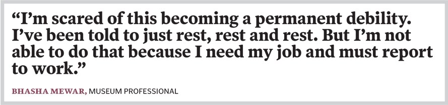 After recovering from Covid, Bhasha Mewar, a museum professional, is forced to take frequent breaks at work because even a little extra exertion aggravates her symptoms