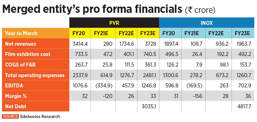 Additionally, in terms of expenses, Naval Seth, Research Deputy Head at Emkay Global Financial Services says, “PVR and INOX have been growing and fighting for premium locations, which led to higher rentals—now the same will get rationalised, F&B sourcing along with vendor consolidation and savings in corporate overheads." In total, as per Emkay Global, the estimated revenue and cost synergies would be Rs 110 crore for each, resulting in EBITDA accretion of Rs 210 crore, excluding any savings on rental and film distributor share. But given the kind of losses both have individually incurred, analysts feel it will take at least three years for the merged entity to reach pre-pandemic levels.
