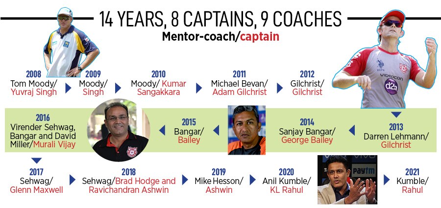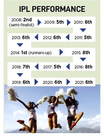 The roller coaster continued over the next few years. From 2008 till 2021, Punjab Kings has had eight coaches/mentors and 10 captains. In 14 years, the team has had just one close shot at the crown, in 2014, and during most of the years, it languished at number six, seven and even eight.