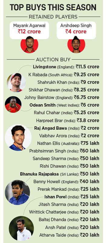 Fast forward to 2022. Punjab Kings enters the IPL auction with the biggest purse of Rs72 crore it retains only Mayank Agarwal and Arshdeep Singh and snaps up three big foreign players in Liam Livingstone, K Rabada and Johny Bairstow (see box). Among Indian ones, it bid aggressively for Shahrukh Khan, Shikhar Dhawan, and Rahul Chahar, and managed to string together a bunch of promising young players, including under-19 hero Raj Angad Bawa.