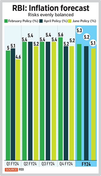 Although the RBI tweaked its inflation forecast by 0.1 percent for the current financial year, it is on the front foot. A closer look at the growth and inflation projections indicates that the RBI is cautious about the second half of FY24—when it expects growth to lose momentum and inflation to rise (see table). There are concerns around higher government spending in the run-up to elections and the impact of weather conditions on food prices. Clearly, despite the recent moderation in price levels, the war against inflation is far from over.
