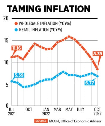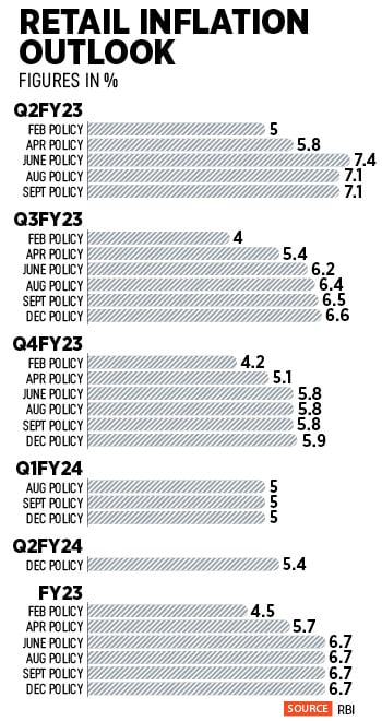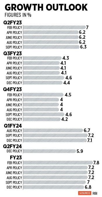 In its December meet, the Reserve Bank of India’s (RBI) Monetary Policy Committee (MPC) raised the benchmark rate by 35 basis points to 6.25 percent while retaining its stance of “withdrawal of accommodation". It cut its growth outlook to 6.8 percent from 7 percent previously and held its inflation estimate of 6.7 percent for the current fiscal year (see table). Interestingly, on Tuesday, the World Bank increased its FY23 GDP forecast for India to 6.9 percent from 6.5 percent in October.