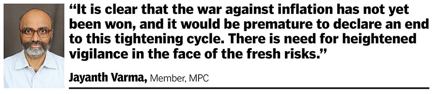 “It is clear that the war against inflation has not yet been won, and it would be premature to declare an end to this tightening cycle. There is need for heightened vigilance in the face of the fresh risks," warned Jayanth Varma.