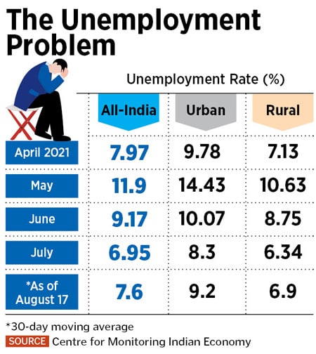 According to the Centre for Monitoring Indian Economy (CMIE), there are close to 40 crore [400 million] people employed in India. While the unemployment numbers fell to a four-month low in July (see table "The Unemployment Problem") in the wake of the ebbing of the second Covid-19 wave, “the number of salaried jobs, which are mostly better quality jobs, fell by 3.2 million [32 lakh]" compared to June, says an Economic Outlook report written by CMIE’s Mahesh Vyas on August 5. This was also 36 lakh short of the 8 crore salaried jobs before the second Covid-19 wave in January-March 2021.