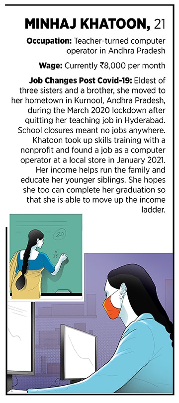 Khatoon, 21, was a teacher earning Rs4,000 per month in Hyderabad when she had to move to her hometown in the rural Kurnool district of Andhra Pradesh in the wake of the lockdown last March. The eldest of three sisters and a brother, school closures meant she could not get any teaching job through the lockdown and even after that. “Koi jobs pe le hi nahin rahe the," she says. No one was giving her a job.
