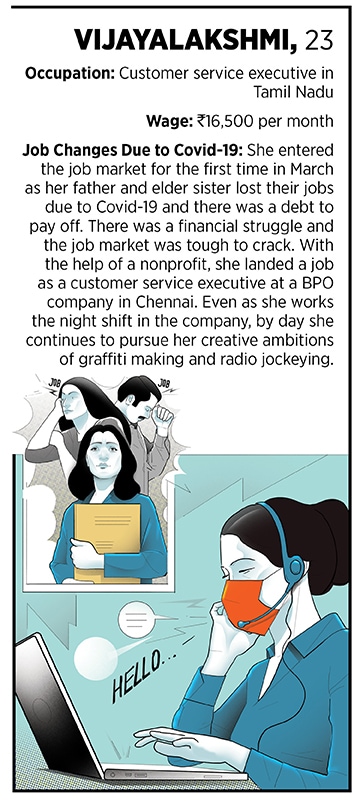 Vijayalakshmi, however, believes that because of the crisis caused by the pandemic, even experienced people are settling for entry-level jobs and lower salaries. The 23-year-old from Singapeumal Koil, about 40 km from Chennai in Tamil Nadu, aspires to be an artist, but had to start looking for a job—any job—after her father and elder sister lost their livelihoods due to the pandemic and the family had to survive on the income earned by her mother, who is a tailor. Vijayalakshmi says she struggled to give interviews and understand what the job market wanted.