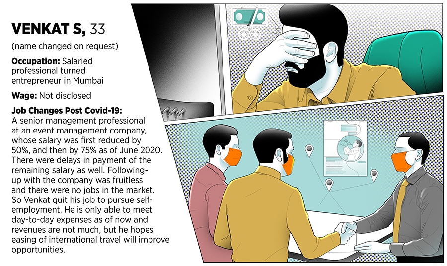 Venkat S (name changed on request), a 33-year-old Mumbai resident, was close to completing three years as a senior management professional at an international events company when the pandemic struck. Salaries initially reduced by 50 percent, and then by 75 percent in June 2020. There were delays of over 25 days in paying the remaining salaries too.
