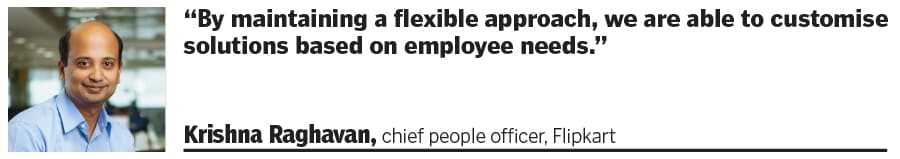 Ecommerce platform Flipart says it has evaluated employee readiness through a combination of team meetings, one-to-one discussions, chatbot conversations, survey and regular check-ins, before reopening the corporate office in phases beginning March. There are policies to ensure people are given appropriate time to manage relocation, child care, elder care and other responsibilities, says Krishna Raghavan, chief people officer, Flipkart. “By maintaining a flexible approach, we are able to customise solutions based on employee needs."