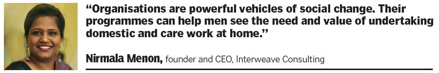 Social constructs are barriers for women to progress at the workplace, but companies can be powerful vehicles of initiating social change, says Nirmala Menon, CEO of Interweave Consulting, a professional diversity consulting organisation. This change can be, for example, using corporate programmes and awareness-building tools to help men see the need and value of undertaking domestic and care work at home. “Already, because of work from home during the pandemic, a lot of men have—even if out of necessity—started playing their part at home. They would also want to continue this going forward and organisations need to support this change."