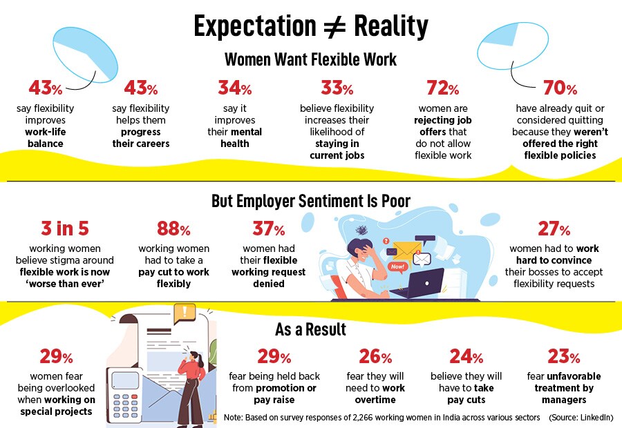 Two years down the line, as many companies firm up their return to office or hybrid working policies, data suggests that they might be giving the same values of flexibility and remote work a side-eye, which can be particularly challenging for women in the workforce. A recent consumer research survey conducted by LinkedIn among 2,266 Indian participants found that three in five working women believe the stigma around workplace flexibility is now ‘worse than ever’, with 88 percent women having had to take a pay cut to work flexibly.