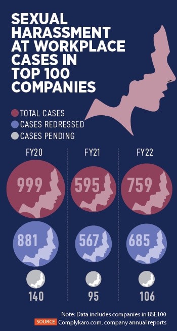 The total number of sexual harassment complaints at workplaces climbed by 27 percent in the financial year ending March 2022 compared to the previous year, according to data analysis compiled by anti-sexual harassment advisory Complykaro.com based on company annual reports. The analysis has considered only companies in the BSE 100 index which account for over 65 percent of total market capitalisation of listed firms in India.