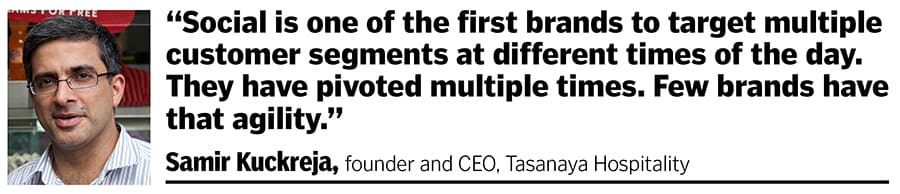 Samir Kuckreja, founder and CEO of Tasanaya Hospitality, a boutique consulting firm, agrees: “I recently read that about 40 percent of restaurants in India shut within the first 12 months. Social is an outlier, which has successfully operated for over 10 years." Kuckreja was formerly the CEO and MD of Nirula’s Corner House and the Joint MD of Yum Restaurants that runs Pizza Hut and KFC in India.