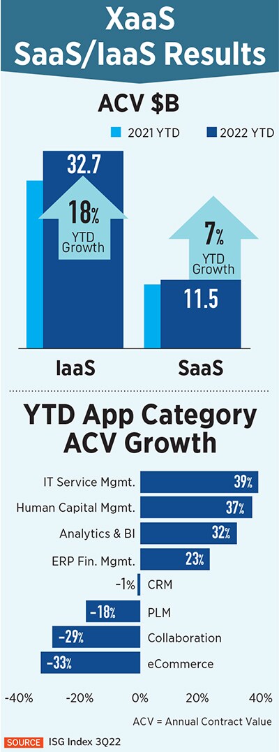 Third-quarter annual contract value declined by 4 percent versus the prior year to $14.1 billion. Of that, at $10.5 billion, infrastructure-as-a-service was flat versus the prior year, while SaaS declined by 12 percent to $3.6 billion, according to ISG.